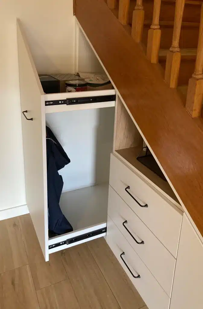 Ne perdez pas de place sous votre escalier. Confiez à JEB Agencement son aménagement avec tiroirs, penderies, placards, étagères... afin d'optimiser l'espace perdu.
