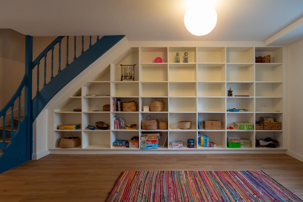 Conception d’une bibliothèque sous-escalier pour optimiser l’espace.