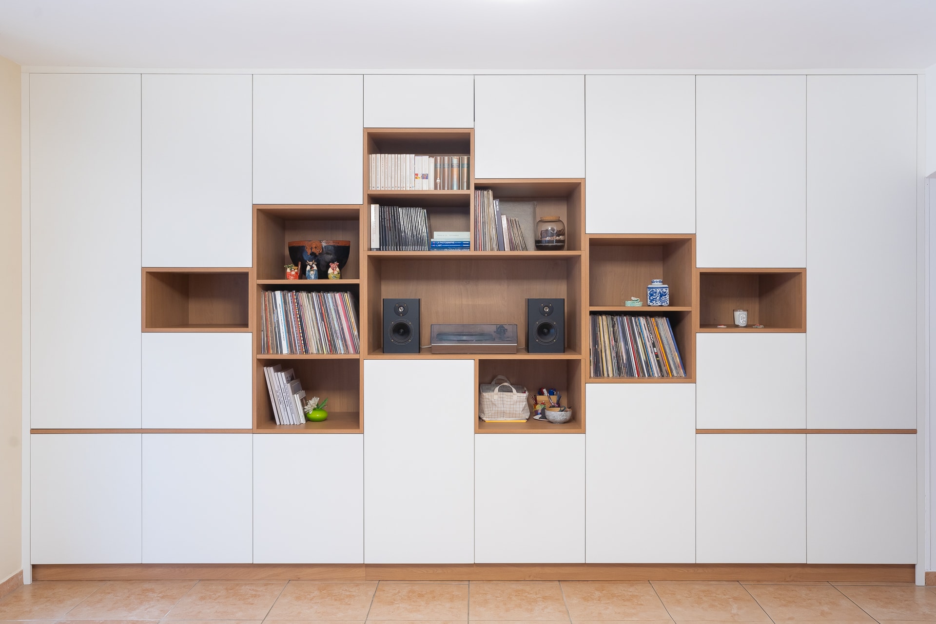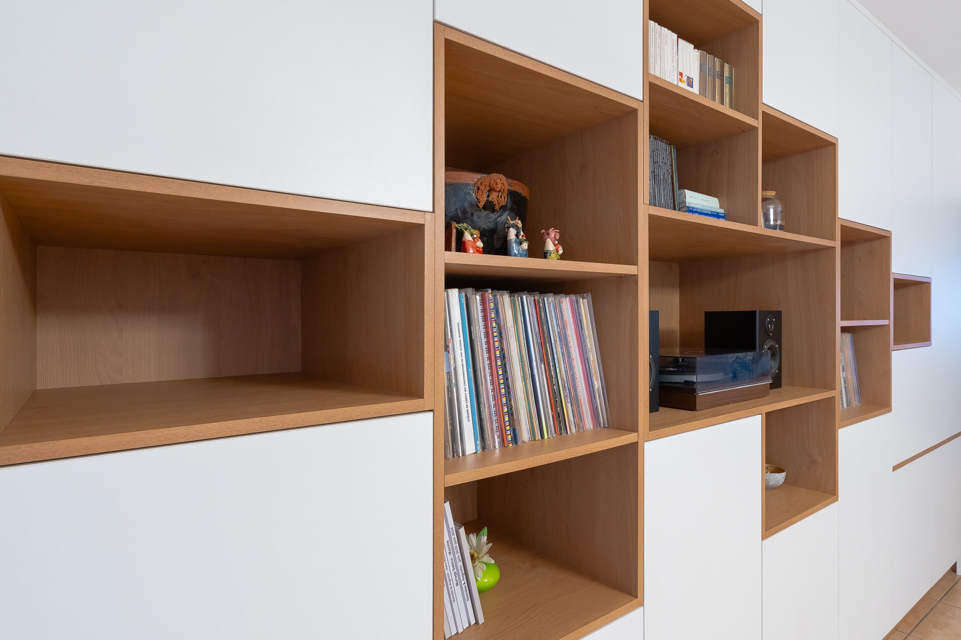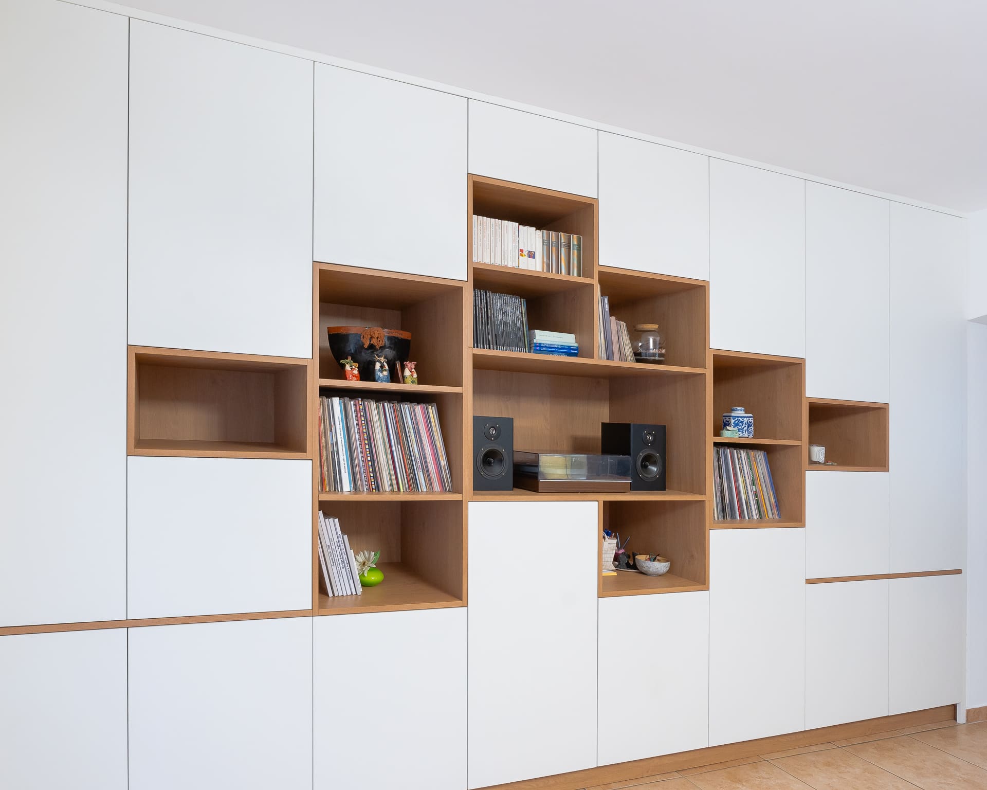 Le client souhaitait intégrer un meuble principal dans son séjour, combinant design et rangements fonctionnels. Son souhait était d’apporter une touche asymétrique tout en restant dans des teintes intemporelles.