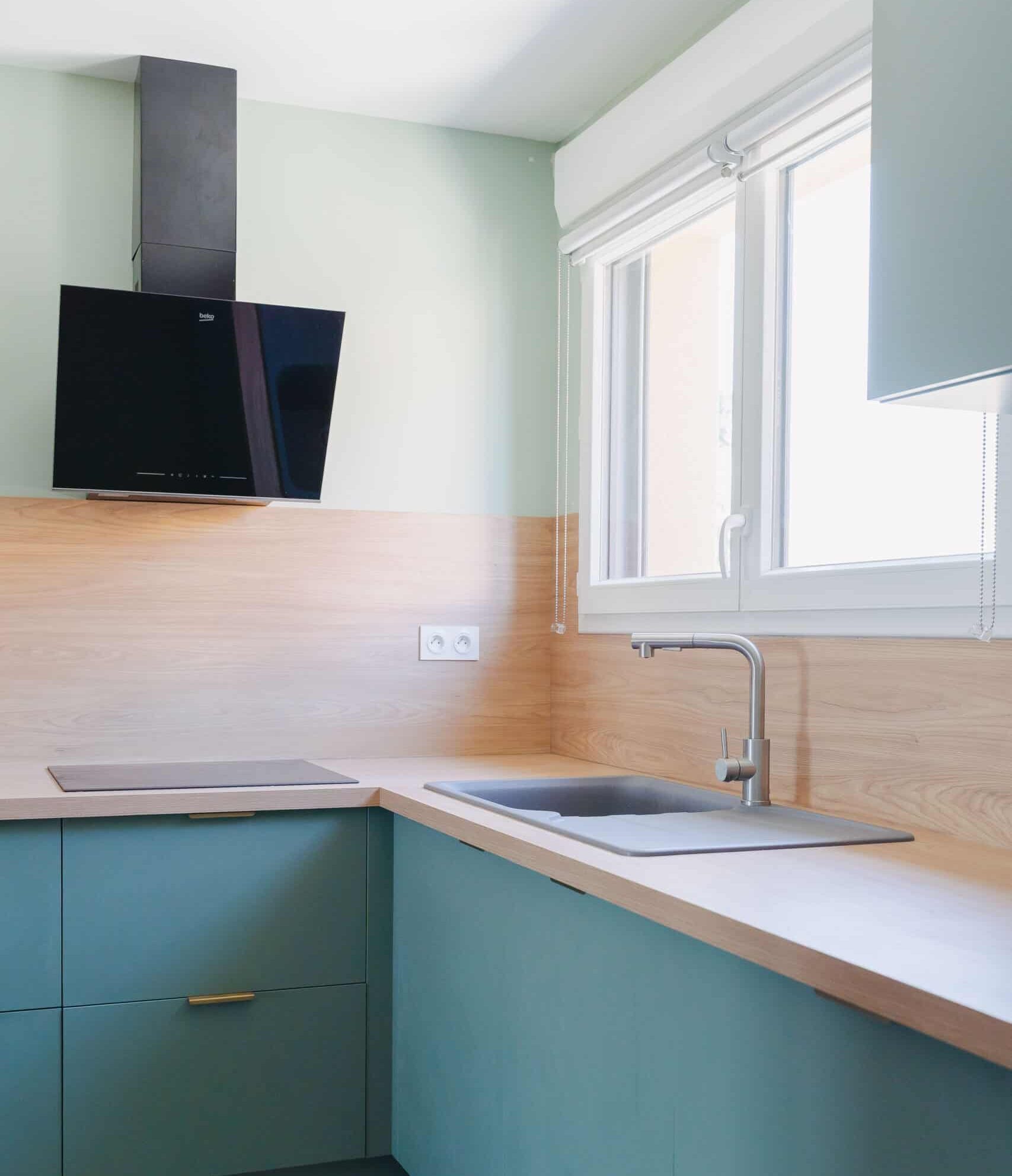 - Un vert affirmé, associé à un aspect bois pour réchauffer l’ambiance.