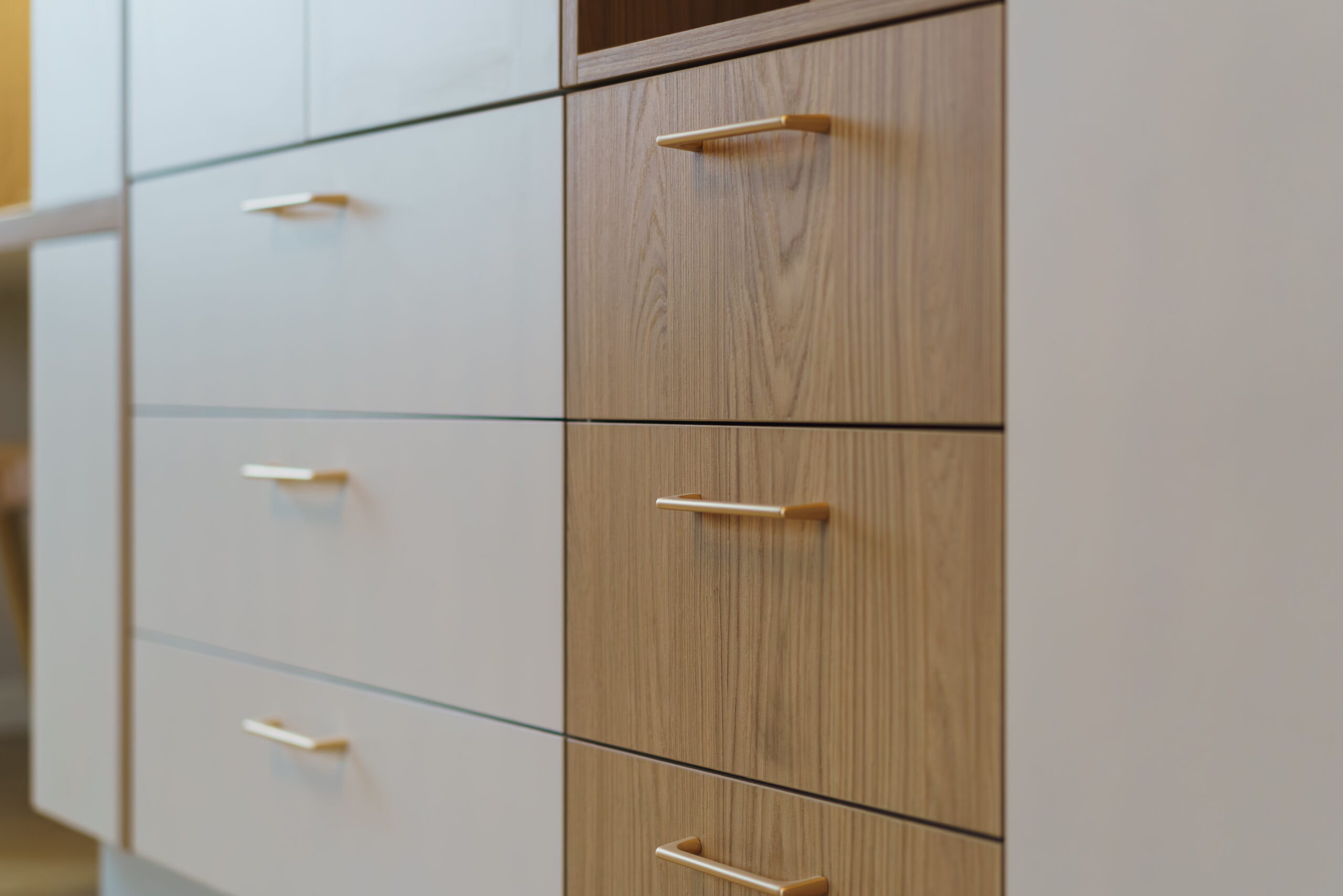 - Sur les tiroirs nous avons ajouté des poignées dorées pour une touche d'élégance. Sur le reste un système Push/Lash pour des lignes épurées.