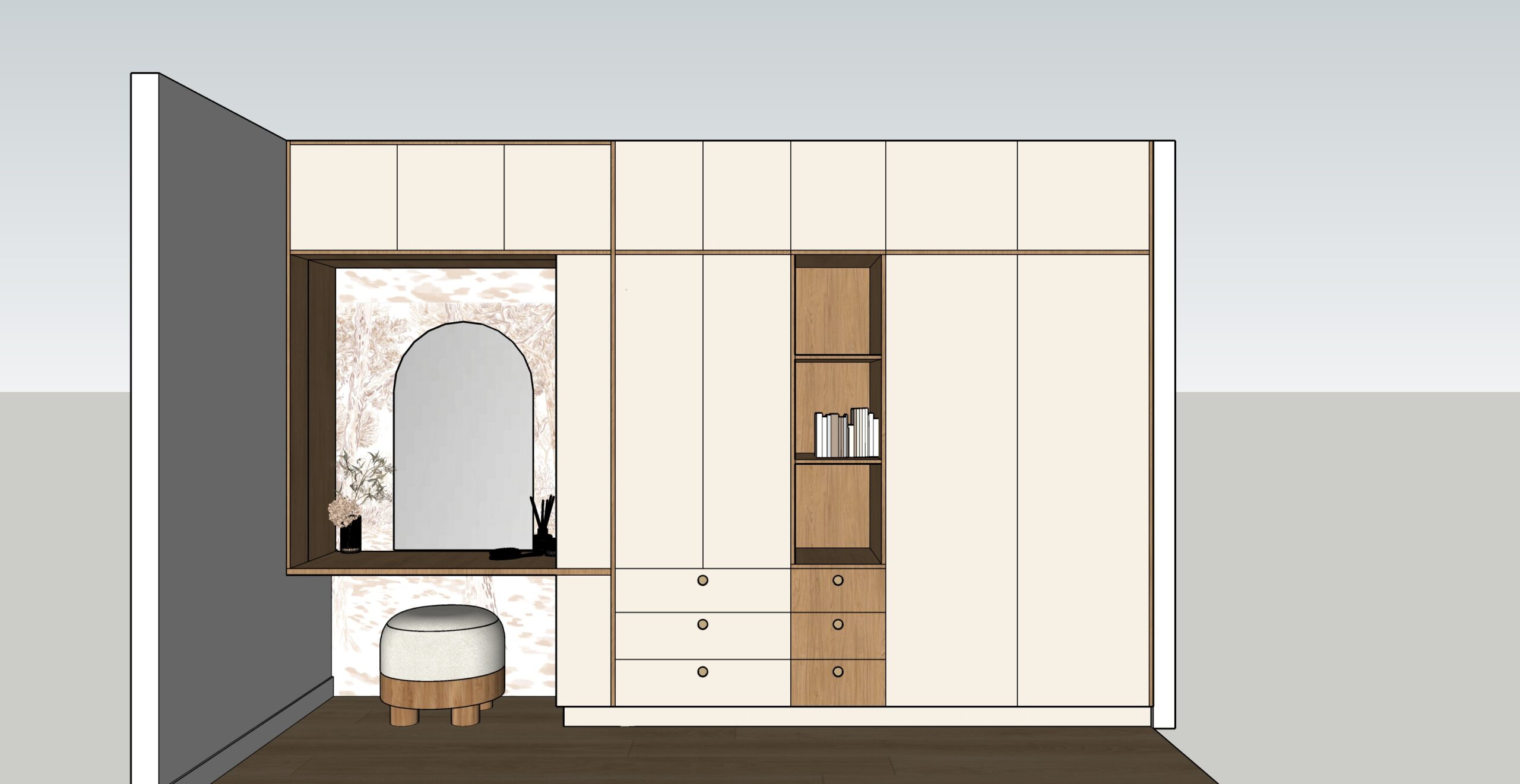 Nos clients souhaitaient un dressing fonctionnel intégrant un coin coiffeuse. L’espace devait être pensé pour offrir un maximum de rangements pour un espace agréable et pratique au quotidien.